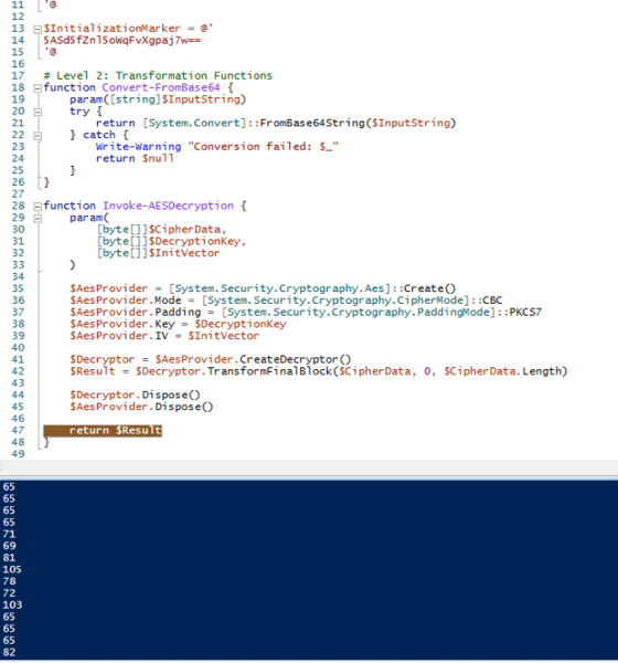 ・メモリ内でのAES復号:ディスク上にフォレンジック痕跡を残さないため、PowerShellスクリプトにはカスタムInvoke-AESDecryption関数が含まれています。この関数は、PKCS7パディングを用いたAES-CBC暗号化を利用し、次の段階をシステムのメモリに直接復号します。