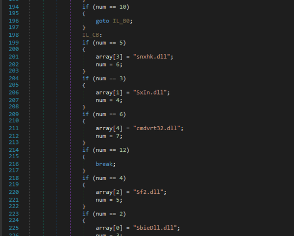 ・セキュリティソフトウェアの検知:システムをスキャンし、snxhk.dll(Avast)、SbieDll.dll(Sandboxie)、cmdvrt32.dll(Comodo)など、サンドボックスやアンチウイルス製品に関連する特定のDLLを探します。