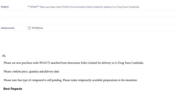 ・誘導要素:攻撃者は、「New purchase order PO0172」のような件名を用いて、受信者に急ぎの対応が必要だと誤認させます。