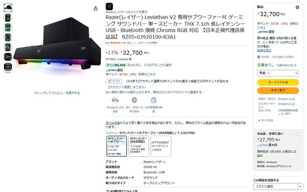 Amazon.co.jpにて、Razerのゲーミングサウンドバー&サブウーファー「Razer Leviathan V2」が販売中だ。参考価格は3万6850円だが、執筆時点では11%オフの3万2700円で購入できる(3月26日時点)。