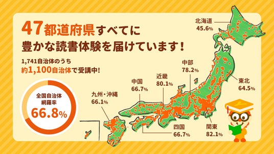 現在、「ヨンデミー」の受講者は都市部にとどまらず地方都市にも広がっており、全国47都道府県すべてでご利用いただいています。受講者がいる自治体の割合は66%に達し、半数以上の都道府県で、地域の3分の2以上の自治体に「ヨンデミー」を利用するご家庭があります。