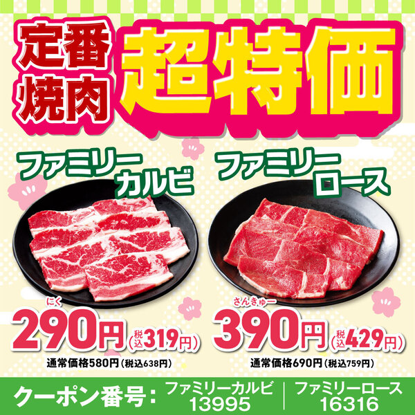 定番のファミリーカルビとファミリーロースを特別価格で販売します。