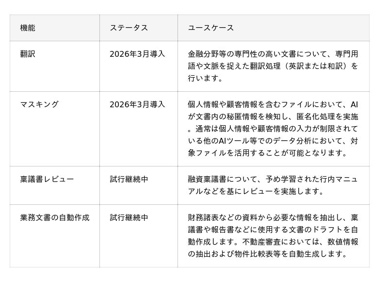 2025年7月発表のPoC開始以来 、厳格な情報保護が求められる銀行実務において、データの安全性確保と生成AIによる業務効率化の両立を追求してきました。この結果 、翻訳・マスキング機能の実用性や、その他の専門業務におけるAI活用の有効性が確認されました。