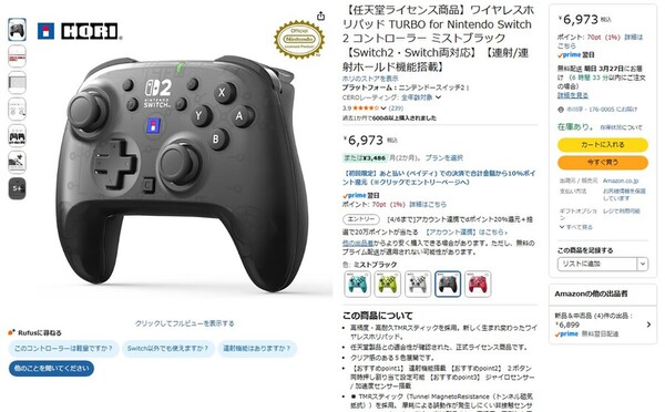 Amazon.co.jpにて、ホリの「【任天堂ライセンス商品】ワイヤレスホリパッド TURBO for Nintendo Switch 2 コントローラー ミストブラック」が販売中だ。価格は6973円。