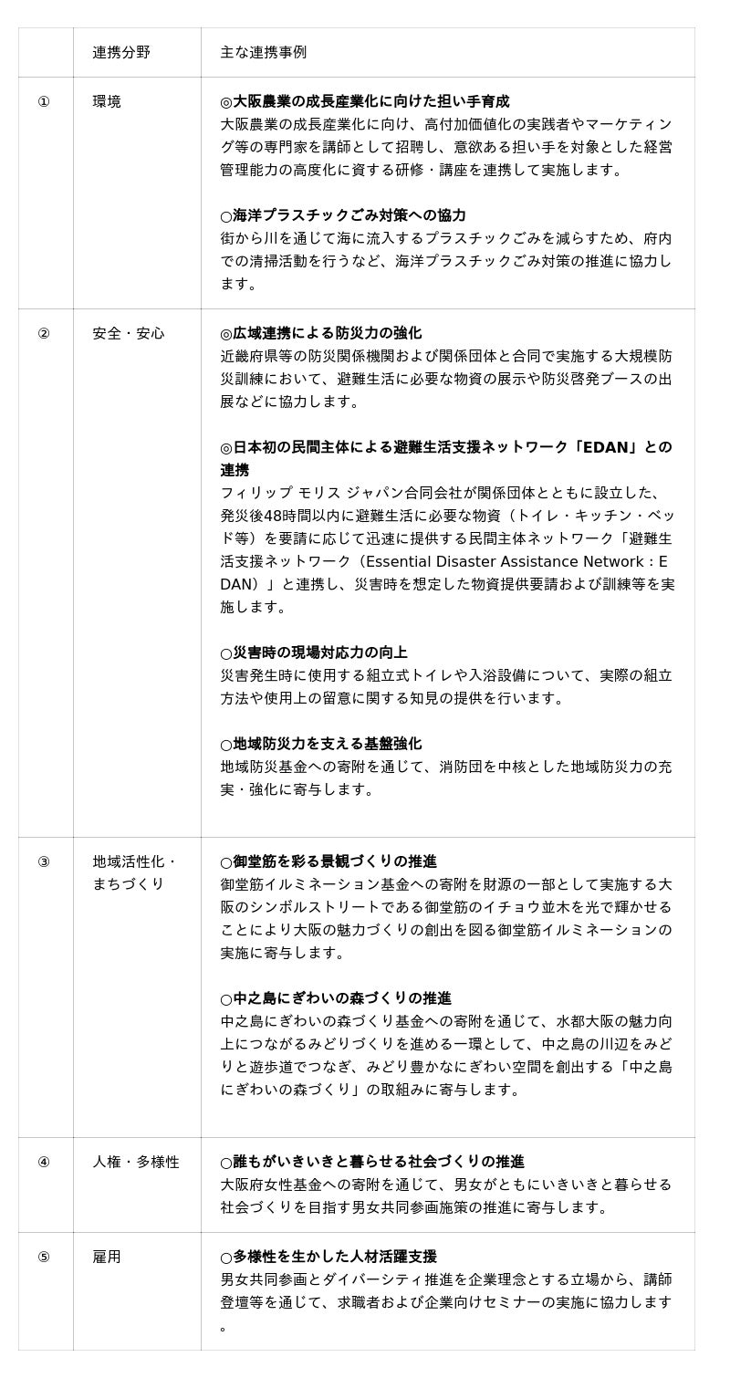 フィリップ モリス ジャパン合同会社(本社:東京都千代田区 社長:シェリー・ゴー、以下、PMJ)は、2026年3月26日、大阪府と「環境」、「安全・安心」、「地域活性化・まちづくり」、「人権・多様性」、「雇用」の5分野にわたる連携と協働に関する包括連携協定を締結しました。PMJが地方自治体と包括連携協定を締結することは、喫煙環境整備以外では今回初となり、同日には締結式も実施されました。