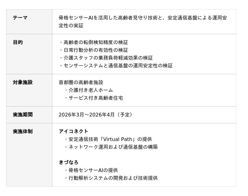 アイコネクトが提供する安定通信技術「Virtual Path」と、きづなろの骨格センサーAIを組み合わせることで、高齢者施設における次世代の見守り基盤の実用性を検証することを目的としています。