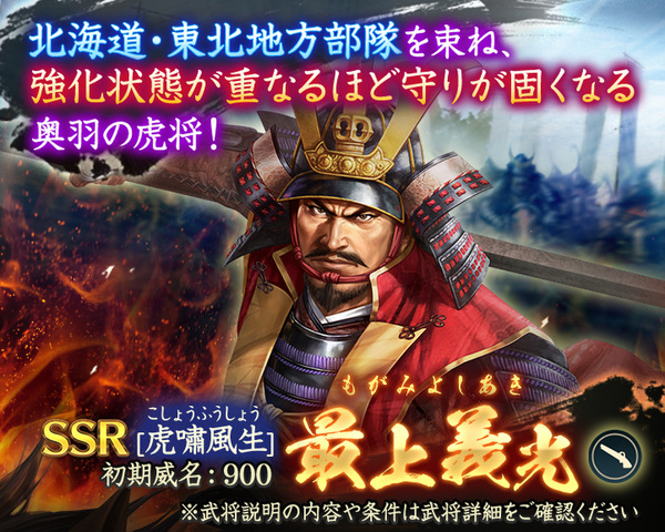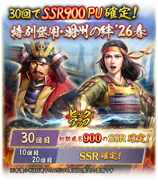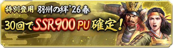 SSR【虎嘯風生】最上義光(最上家)とSSR【虎将の勇妹】義姫(伊達家/最上家)(いずれも初期威名900)がピックアップされる「特別登用・出羽を駆ける虎将」を開催。開催期間は、2026年4月16日12時59分まで。