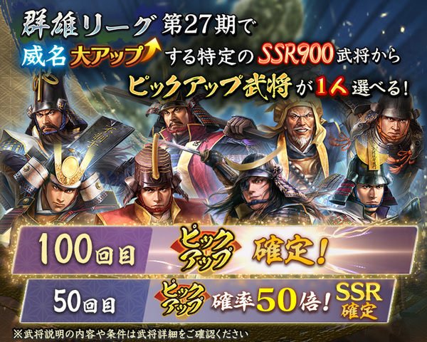 対象の武将はボーナスにより「群雄リーグ 第27期」で威名がアップするので、上手く活用して、その名を轟かせよう。