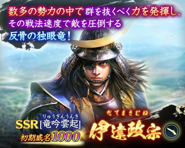 「将星特別登用・伊達政宗 '26春」を開催。初期威名1000のSSR【竜吟雲起】伊達政宗が単独ピックアップされる。