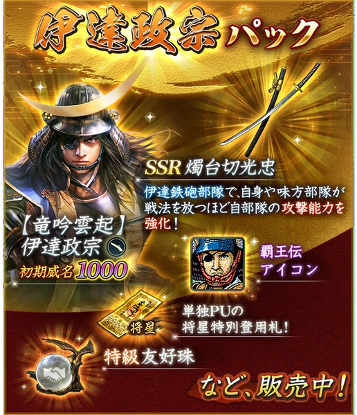 「信長の野望の日パック」「伊達政宗パック」を各種販売。詳細はゲーム内で確認してほしい。