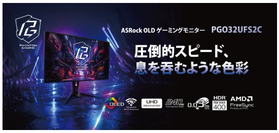 「PGO32UFS2C」は、ASRockの新製品の中でも特に注目すべきモデルで、4K/240Hzの高リフレッシュレートや0.03msの応答速度、高精度カラーを備えたWOLEDディスプレイを採用している。加えて、VESA DisplayHDR True Black 400やAMD FreeSync Premium Proといった最新技術に対応しており、ゲーマーにとって理想的な視聴体験を提供する。価格は149,800円である。