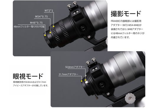 - FRA400Cは、人気の「FRA400」の光学系を踏襲しつつ、カメラレンズのようなヘリコイドによるフォーカス操作と絞り羽根の操作が可能になった、初心者にも扱いやすい望遠鏡です。