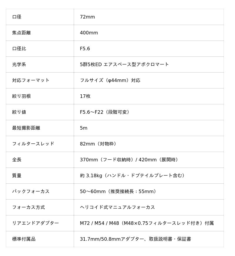 - 対物側フィルタースレッドはM82(82mm径)を採用。リアエンドアダプターはM72・M54・M48(M48×0.75フィルタースレッド付き)の3種類が付属し、幅広いカメラや周辺機材に対応します。