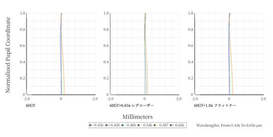 - フラットナー使用時のスポット半径は中心で約2.1μm、フルサイズ最周辺で約2.5μmと、中心から周辺まで均質でフラットな撮像範囲を得られます。