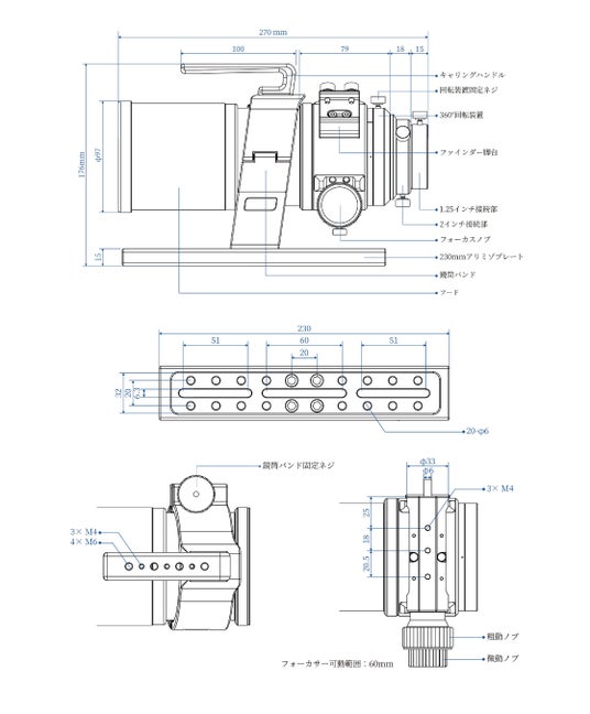 - 全長230mmの45mm幅ドブテイルバーを採用。曲線デザインの金属製鏡筒バンドは、大型の手締めロックボルトを装備し、鏡筒を確実に固定しつつ開閉操作をスムーズに行うことができます。