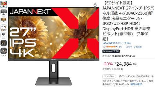 JAPANNEXTの27インチ液晶モニター「JN-IPS27U2-HSP」がAmazonで割引対象。参考価格30,481円のところ、20%オフの24,384円で販売中。