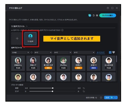 ※AI 音声クローン機能の使用にはクレジットが必要となります。一つの音声プロファイルを作成するごとに20クレジット消費されます。