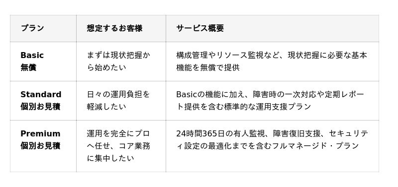 お客様の運用体制や予算に合わせて選択できる3つのプランを用意しました。
