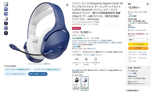 Amazon.co.jpにて、HyperXのデュアルワイヤレスゲーミングヘッドセット「HyperX Cloud Jet(ライトブルー)」が販売中だ。参考価格は1万1980円だが、タイムセールにより25%オフの8980円で購入できる。