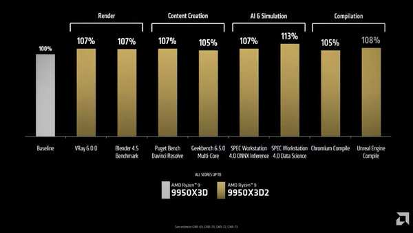 性能面では、既存モデル「Ryzen 9 9950X3D」と比較し、5~10%の性能向上を実現。特にDaVinci ResolveやBlenderといったクリエイティブ用途、さらにUnreal EngineやChromiumのような大規模なソースコードビルドにおいて、その効果が顕著だとしている。