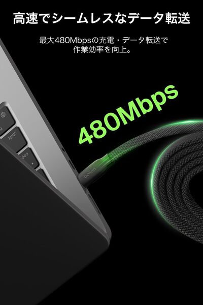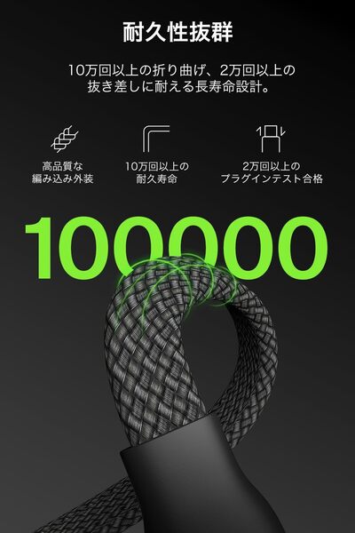 大容量データを高速転送する用途には向きませんが、普段使いのケーブルとしてはむしろ割り切りが効いている印象。耐久性や安全性にも配慮されており、日常的に使い倒す前提の設計になっています。