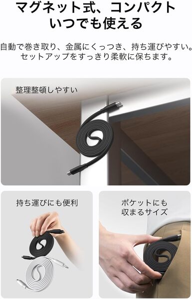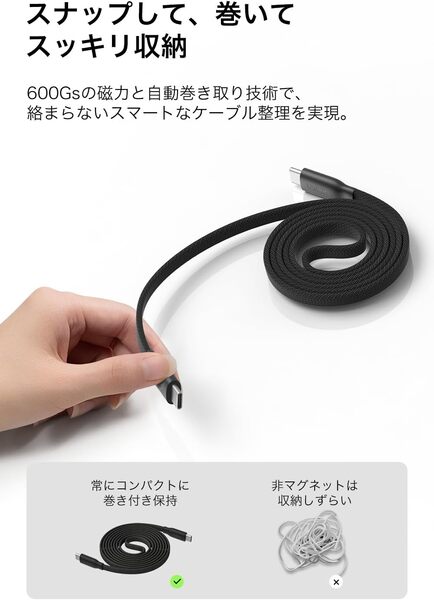 この製品が面白いのは、単なる高出力ケーブルで終わっていないところです。平型デザインに加えて、マグネットでまとまる構造を採用しており、使い終わったあとも自然とコンパクトに収まります。