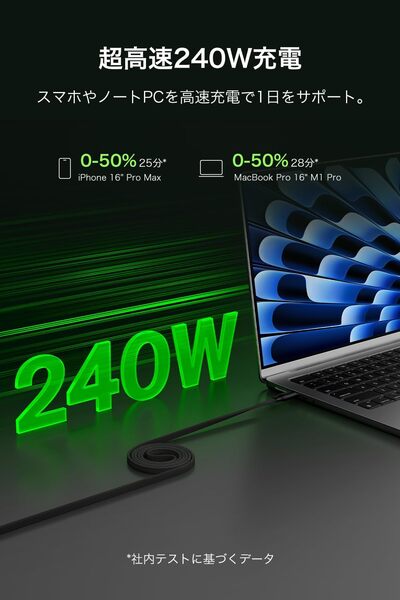 240W対応という安心感に加え、片付けやすくて、絡まらない。地味といえば地味。しかし、気づけば他のケーブルに戻れなくなるかもしれません。スペック競争の次に来るのは、こういう快適さなのかもしれない……と感じさせてくれる1本です。