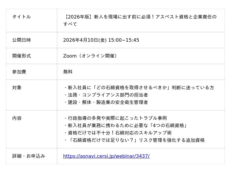 クラウド型アスベスト業務管理システム「アスベストONE」を提供する株式会社EMS(本社:東京都千代田区、代表取締役:星 美耶)は、建設・解体などの工事関係者を対象に、アスベストの基礎知識と現場での安全対策を解説する無料Webセミナーを公開することを発表しました。