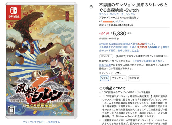 前置きが長くなりました。日本において、ローグライクの概念と楽しさを幅広い層に知らしめたシリーズといえば、「不思議のダンジョン」シリーズでしょう。今回オススメしたいのは、「不思議のダンジョン 風来のシレン6 とぐろ島探検録」です。Switch 2版の参考価格は6,985円ですが、Amazonでは24%オフの5,330円(3月27日現在)となっています。