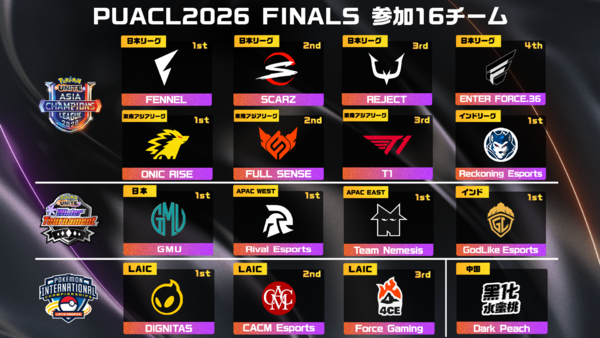 戦略バトルゲーム『ポケモンユナイト』の公式国際大会「Pokémon UNITE Asia Champions League 2026」(以下、PUACL2026)では、日本・アジア・インドの3地域でリーグ戦を実施し、熱い戦いが繰り広げられました(関連記事)。そして3月28日、29日に、各地域の上位チームと海外強豪招待チームの計16チームが日本に集結し、オフライン決勝大会「PUACL2026 FINALS」が開催されました。