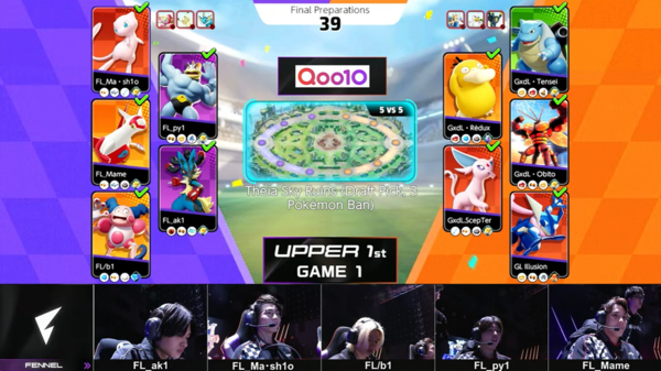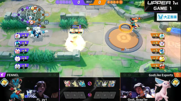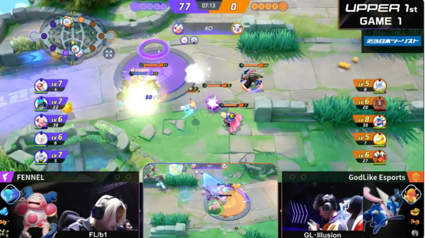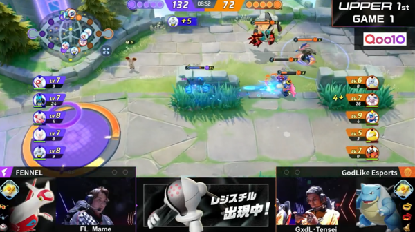 さすがと思ったのは、やはりFENNEL対GodLike Esportsの1試合目。FENNELは巧みなチームワークで、相手チームの1人がわずかに孤立した瞬間や、人数有利の瞬間を瞬時に察知し、集団で襲撃してリードを奪います。それを何度か繰り返していくうちに相手との経験値の差を広げていくさまは、ポケモンユナイトのお手本的な動きだなとマジマジと感じました。