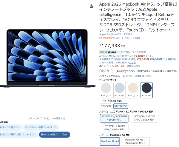 Appleの13.6インチノート「MacBook Air(M5)」がAmazonで販売中。Apple公式価格184,800円のところ、Amazonでは177,333円で購入できます!