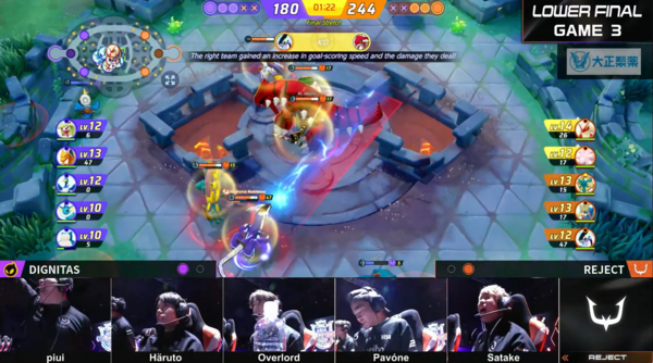 泣いても笑っても勝者だけがグランドファイナルへ進む3戦目。またもやカイリキーはバンされました。ユナイト技を重視したDignitasと、継続的ダメージが強いREJECT。集団戦を避けたいREJECTは、序盤でも果敢に浮いた相手を倒す動きをみせ、それが見事にささります。