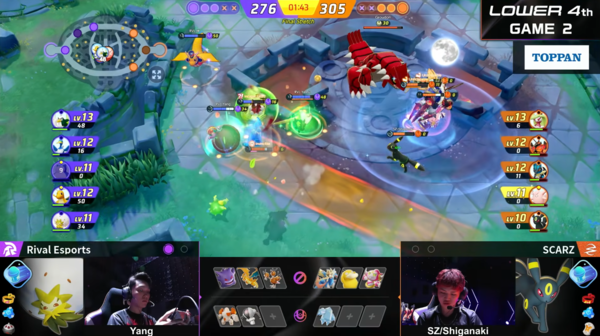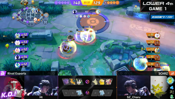 SCARZ対Rival Esportsの試合では、序盤が強いRival Esportsのポケモン構成に、SCARZがどう耐えるのかという戦いになりました。1戦目はさすが東南アジアの覇者といわれるRival Esportsだけあって、わずかな隙を見逃さずに、SCARZのポケモンが育ち切る前に経験値の差を広げていき、グラードンのバフも獲得してその勢いのまま勝利を収めました。