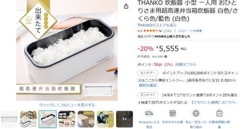 THANKOの弁当箱炊飯器「おひとりさま用超高速弁当箱炊飯器」がAmazonで割引対象。参考価格6,980円のところ、20%オフの5,555円で販売中。