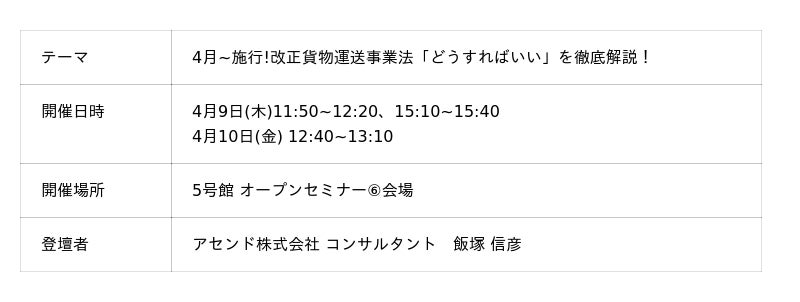 本展示会では、当社製品『ロジックス』の最新機能が体験できるブースをご用意しております。あわせて、改正貨物自動車運送事業法への対応をテーマに、施行までに押さえておくべきポイントや実務対応について解説するセミナーも開催いたします。