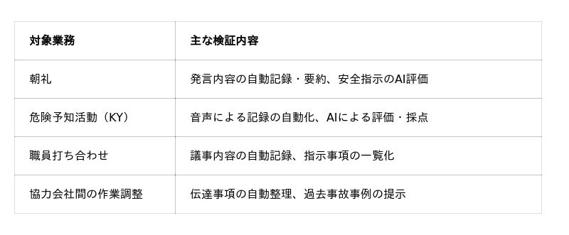 朝礼・危険予知活動・社員打ち合わせ・作業間連絡調整の4業務において、音声を活用した記録の自動化が可能であることを確認します。これにより従来、担当者が手作業で行っていた記録・整理・報告の各工程を大幅に効率化できる見通しです。