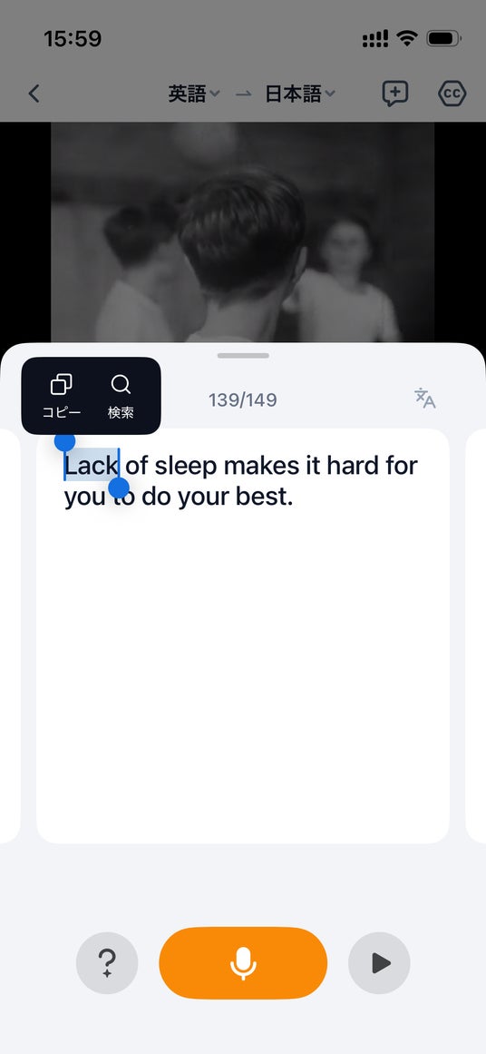 動画翻訳や音声翻訳の利用後、字幕を長押しするだけで学習モードに入ることができます。対話翻訳では、翻訳バブルを長押しすることで、該当文の学習画面へ即座に移行できます。