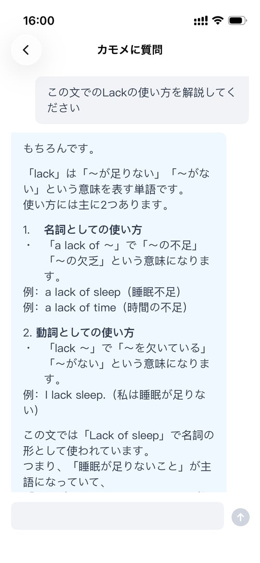 また、現在の文をもとに、文法構造や使用シーン、表現の違いなどについてAIに質問することも可能で、より深い理解を促進します。