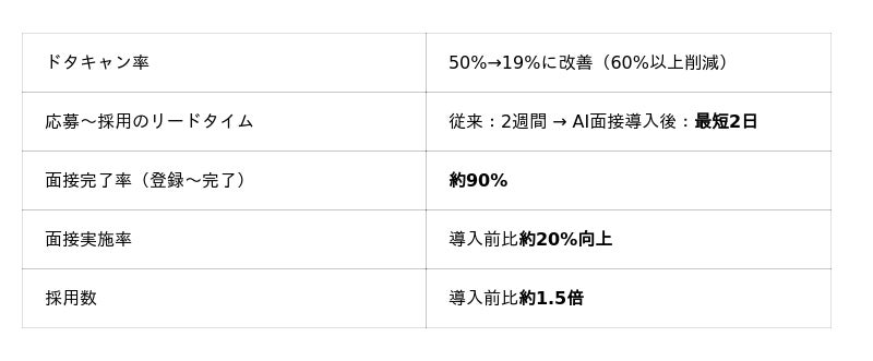 既存のAI面接ツールに対しては「高すぎて導入できない」「導入しても候補者が面接を受けてくれない」といった声が多く聞かれますが、本サービスは1面接1,000円~の低コスト構造と、ノンデスクワーカー中心でも約90%の面接完了率を実現することでこれらの課題を解消。