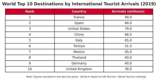 2019年(コロナ前)観光は過去最高水準。日本は、夢の大台3,000万人を超えるも、まだトップ10圏外でした。