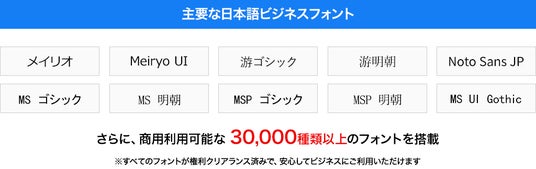 また、商用利用可能な3万種類以上のフォント搭載で企業の標準資料の再現だけでなく、ブランドイメージを意識した動画や、より表現力の高いコンテンツ制作にも対応。実務資料の再現性とクリエイティブ表現の両方を支えるフォント環境を提供します。
