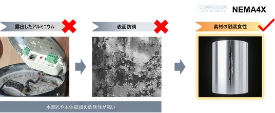 - NEMA 4X 耐食性能:耐食素材を採用。表面が傷ついても内部の耐食性が維持されるため、沿岸部などの厳しい環境下でも安心して使用できます。