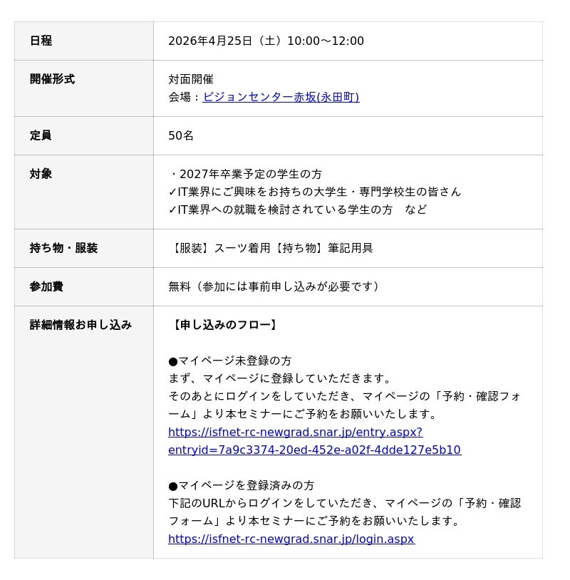 株式会社アイエスエフネット(本社:東京都港区/代表取締役:渡邉幸義、以下アイエスエフネット)は、2026年4月25日(土)にビジョンセンター赤坂(永田町)にて、27年卒向け「社長登壇!トップセミナー」を開催します。当日は代表の渡邉が登壇し、就職活動中の学生に、アイエスエフネットの魅力を直接お伝えします。