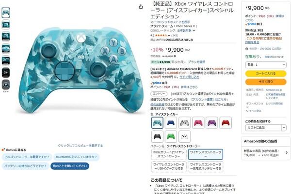 Amazon.co.jpにて、マイクロソフトの「【純正品】Xbox ワイヤレス コントローラー (アイスブレイカー)スペシャルエディション」が販売中だ。参考価格は1万1000円だが、執筆時点では10%オフの9900円で購入できる(3月30日時点)。