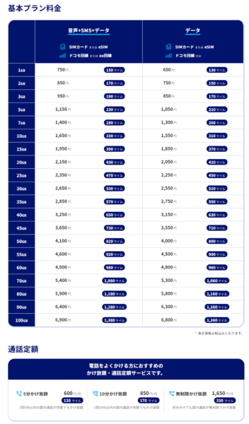 たとえば、音声30GBプラン(月額2650円)に無制限かけ放題(1650円)を組み合わせた月額4300円の利用で、毎月860マイル、年間では1万320マイルが自動的に貯まる計算です。データプランは1GB(750円)から最大100GB(6900円)まで全20段階と細かく設定されており、ヘビーユーザーにも対応しているのが特徴。新規契約時には初期費用として3300円がかかりますが、500マイルのプレゼントも用意されています。
