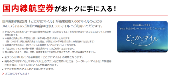 一方、JALモバイルの魅力は、国内線往復特典航空券「どこかにマイル」の優待です。通常7000マイル必要なこの大人気特典が、JALモバイル契約者は年1回、たった「1500マイル」で利用できる権利が付与されます。