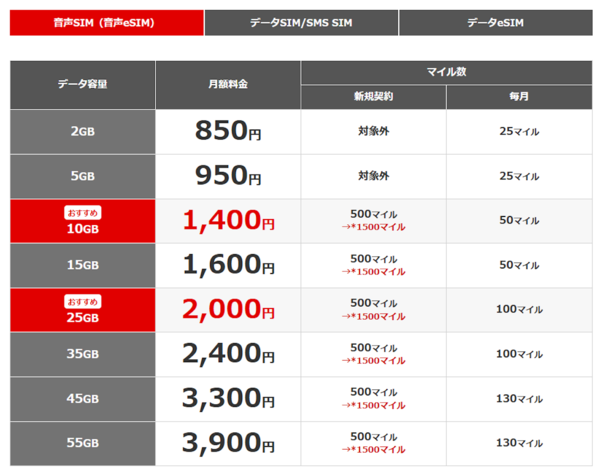 月額料金は2GB(850円)から最大55GB(3900円)まで用意されており、たとえば25GBプランは2000円とコストパフォーマンスも優秀。毎月の利用プランに応じて5~130マイルが貯まるほか、JALグループ便の利用で国内線50マイル・国際線100マイルのフライトボーナスマイルも加算されます。